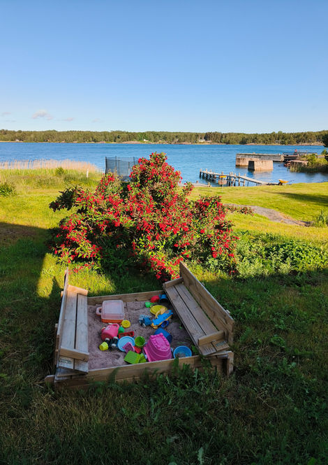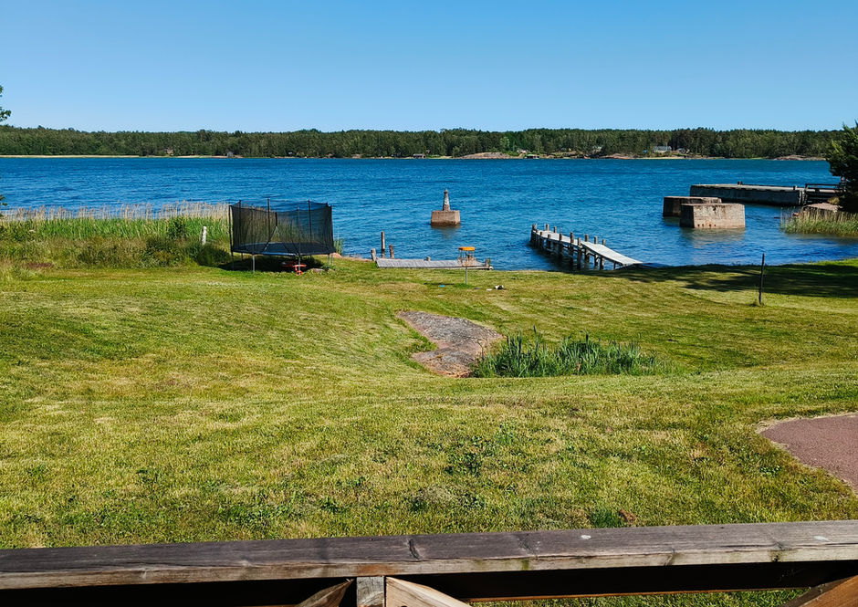 Planerad tomt med tallar, buskar och välskött gräsmatta ner till strandkanten. Vid stranden finns en rejäl brygga och en fin badstrand.